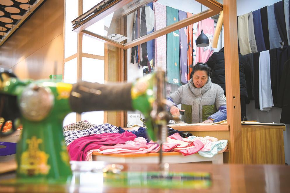 位于桂巷集市的倪记裁缝店内,店员正在为顾客服务