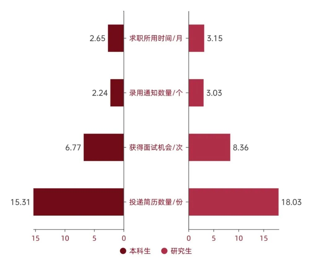 上海科技大学调查则表明,37.78%的就职毕业生在一个月内即完成了择业,尤其有高达57.14%比例的本科生在一个月内完成了择业,大多数就职毕业生的择业过程未超过6个月,仅4.44%的就职毕业生择业过程在6个月以上。总体上,平均每位就职毕业生在求职时发送了9.49份求职简历,求职期间获得了3.89次面试机会,最终获得了2.29份录用通知书。