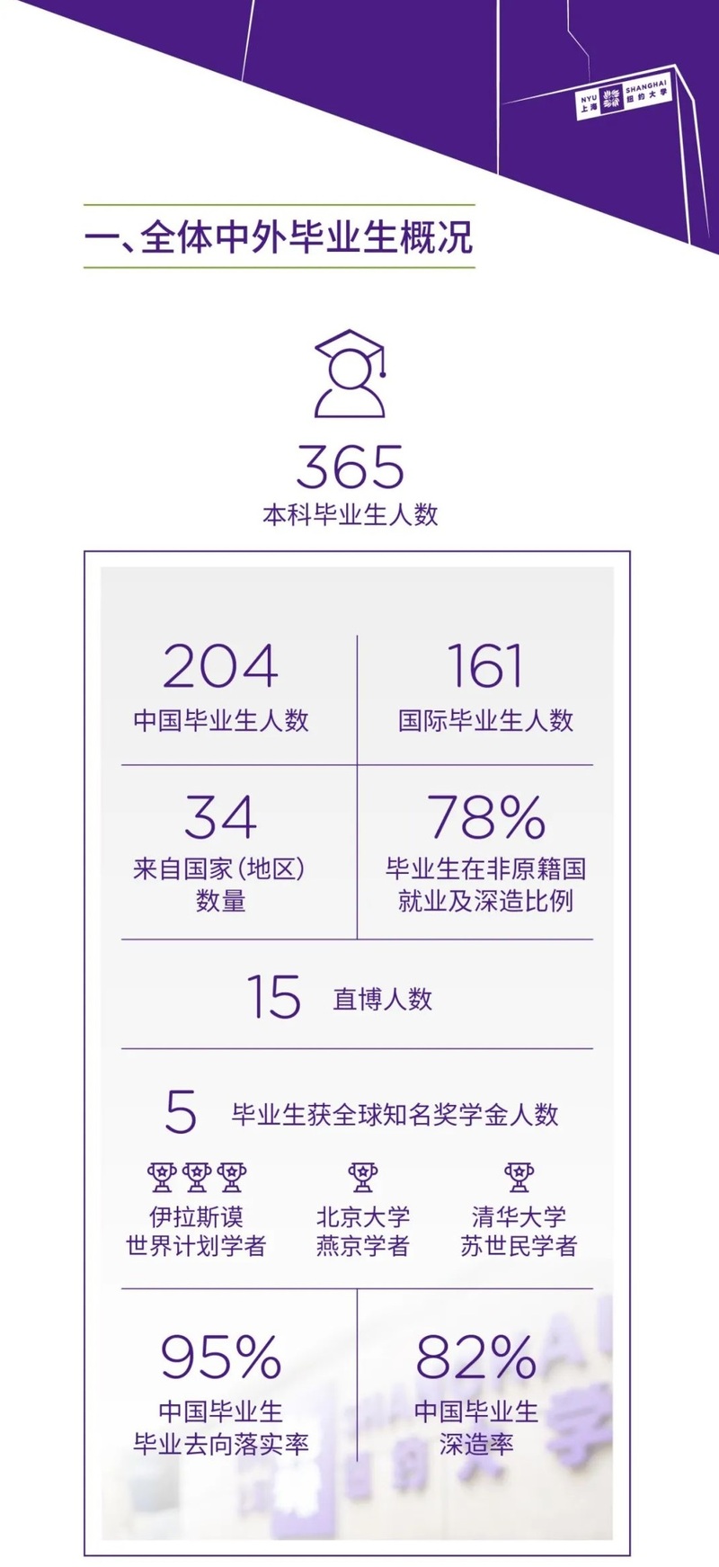 在中外合作举办的上海纽约大学,全体毕业生深造率也达62%。其中,15人在本科毕业后直接被全球顶尖博士研究生项目录取,175人攻读硕士研究生项目。尤其是中国毕业生,82%选择继续深造,人均获得3.8份录取通知书。