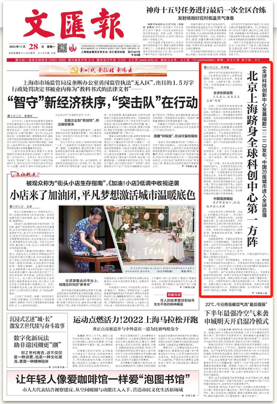 文汇报 头版丨北京上海跻身全球科创中心第一方阵