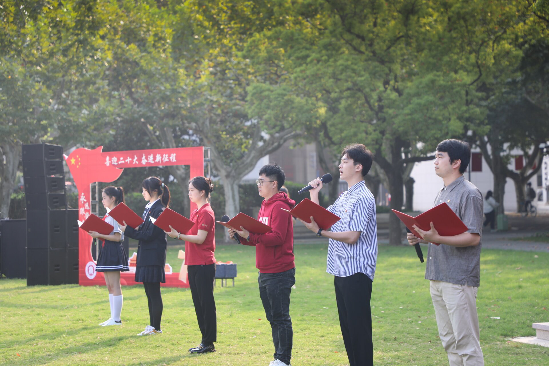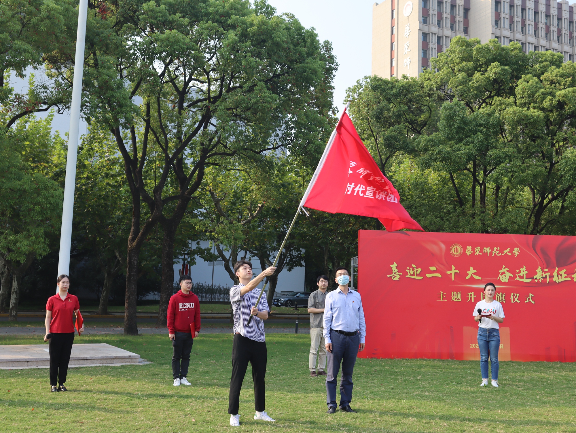 喜迎二十大,以青年之声,传播正能量,让党的思想理论走进校园、走进社区,强化青年的责任与担当。升国旗后,华东师大“新时代宣讲团”出征仪式举行,华东师大副校长顾红亮为“新时代宣讲团”授旗。