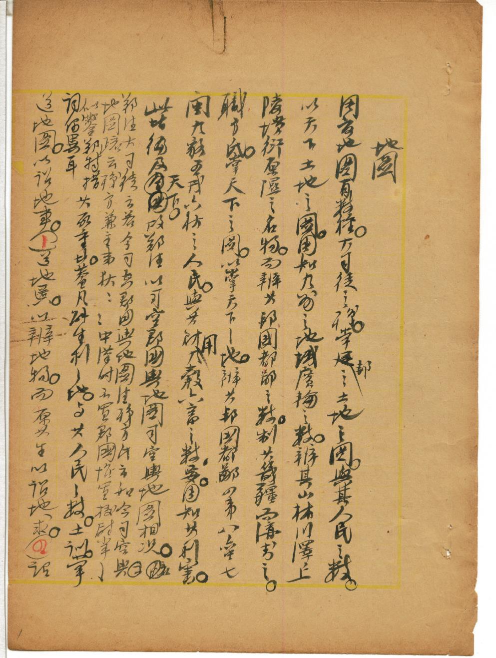 上地理课,必带一上海商务印书馆所印中国大地图。先将各页拆开,讲一省,择取一图。先在附带一小黑板上画一十字形,然后绘此一省之四至界线,说明此一省之位置。再在界内绘山脉,次及河流湖泽。说明山水自然地理后,再加注都市城镇关卡及交通道路等。一省讲完,小黑板上所绘地图,五色粉笔缤纷皆是。听者如身历其境,永不忘怀。
