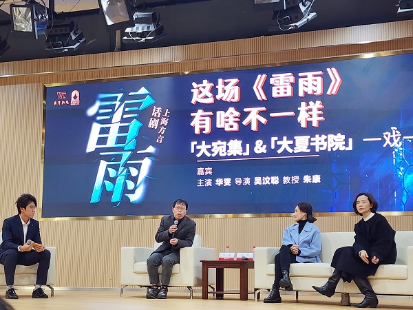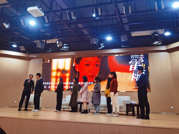 沪语版《雷雨》进校园还圈了不少留学生粉丝,来自马来西亚、日本、新加坡等国的20余名留学生前来观看。活动现场,师生们共同欣赏了海派《雷雨》的经典片段“鲁贵说鬼”。上海戏剧学院戏曲导演专业教师、上海方言话剧《雷雨》导演吴汶聪与现场观众分享了主创团队在剧作改编和舞美服装元素的运用方面所作的探索。华东师大国际汉语文化学院副教授朱康讲述了话剧《雷雨》创作的时代背景和其背后深厚的思想内涵。