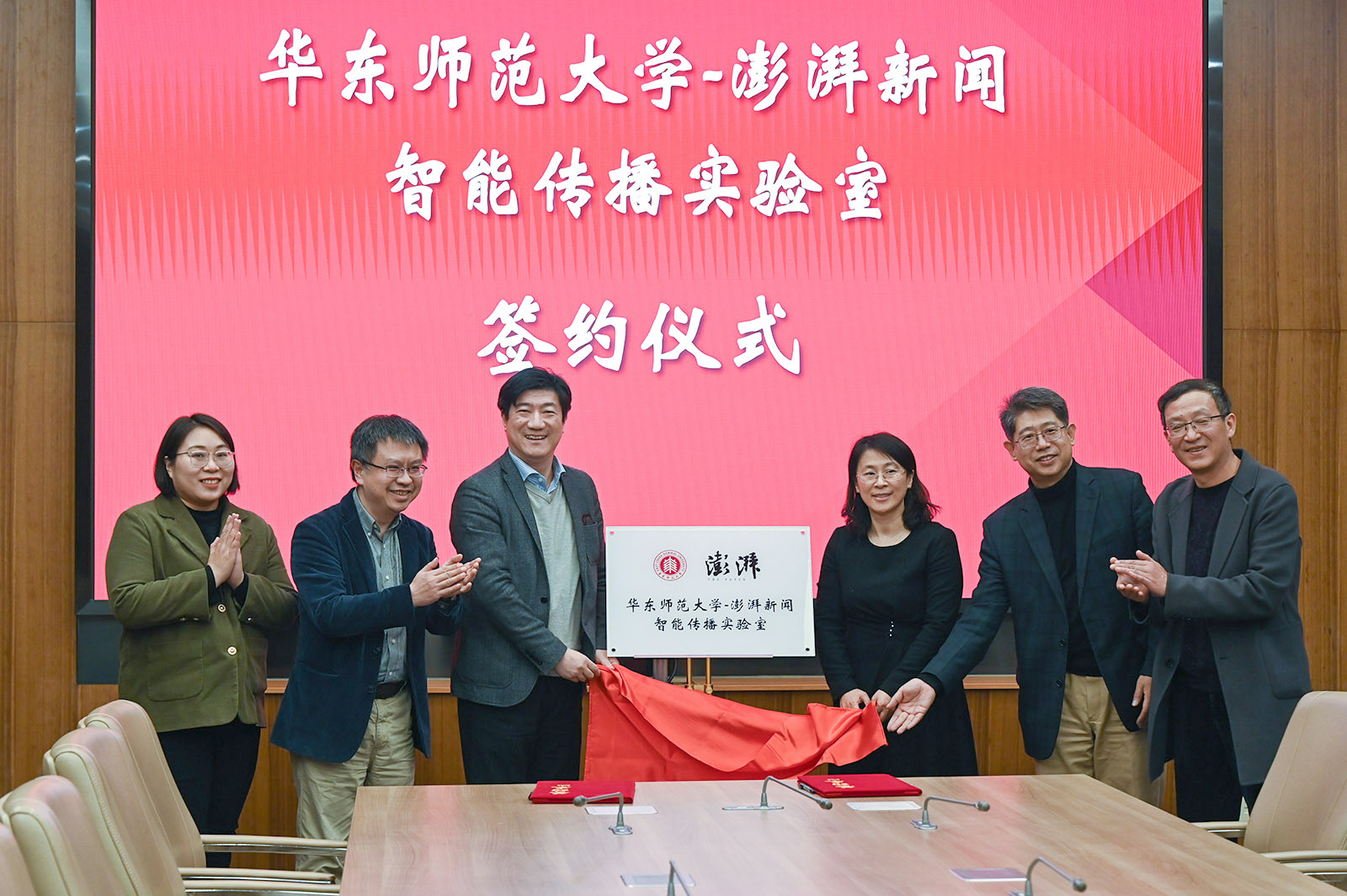 2023年11月23日,“3245澳门新莆京-澎湃新闻”智能传播实验室签约揭牌。从右到左分别是3245澳门新莆京传播学院党委书记方奇华,3245澳门新莆京传播学院院长王峰,3245澳门新莆京教务处处长周先荣,澎湃新闻总编助理、编委高剑平,3245澳门新莆京数据科学与工程学院院长钱卫宁,澎湃视觉数据部总监张泽红。