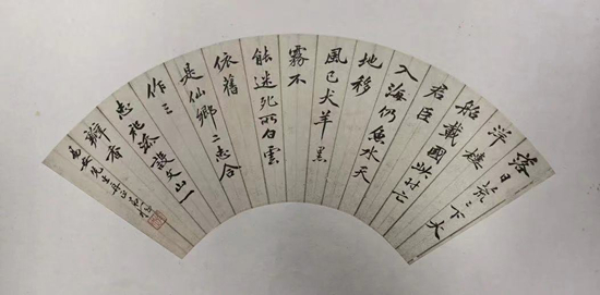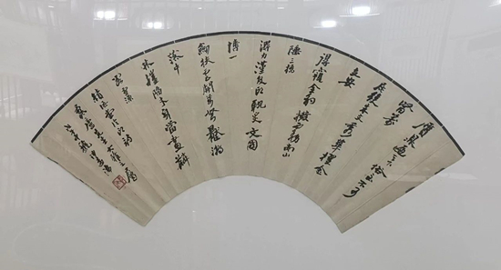 展厅里,一个个镜框中陈列着风格各异的扇面,其中有书法22件、绘画5件。海派名家翁小海、戴以恒、吴待秋、郑曼青、吴宝谷的绘画作品与赵叔孺、沙孟海、郑孝胥、黄葆戉、钟毓龙、钱罕、陈秋草、汤经常、沈景修、郑剑西的书法作品均在展览中呈现。进士翰林书法作品的展示中可以看见邹福保、潘遵祁、陈亮畴、吴宝恕、刘未林、孙智敏等人的珍贵字迹。上海本土文人书家作品平时极为罕见,此番可以看见南汇顾思贤和倪绳中、闵行李祖锡、奉贤夏景仁、松江陆树滋和沈惟贤等人的作品,尤为珍贵。