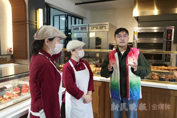 图说:邱力为面包店员工答疑 新民晚报记者 刘歆/摄