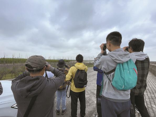从视野广阔的滩涂、郁郁葱葱的林边到茂密的芦苇荡,甚至是停车场树林与水闸,“北红委屈”队在各个点位来回穿梭,打卡的鸟种逐步攀升。记者观察到,3名队员的眼睛永远朝远处张望,如同GPS般精准定位。他们无暇顾及旁逸斜出的枝条,踩到淤泥水坑好似习以为常,日行上万步更是乐此不疲。