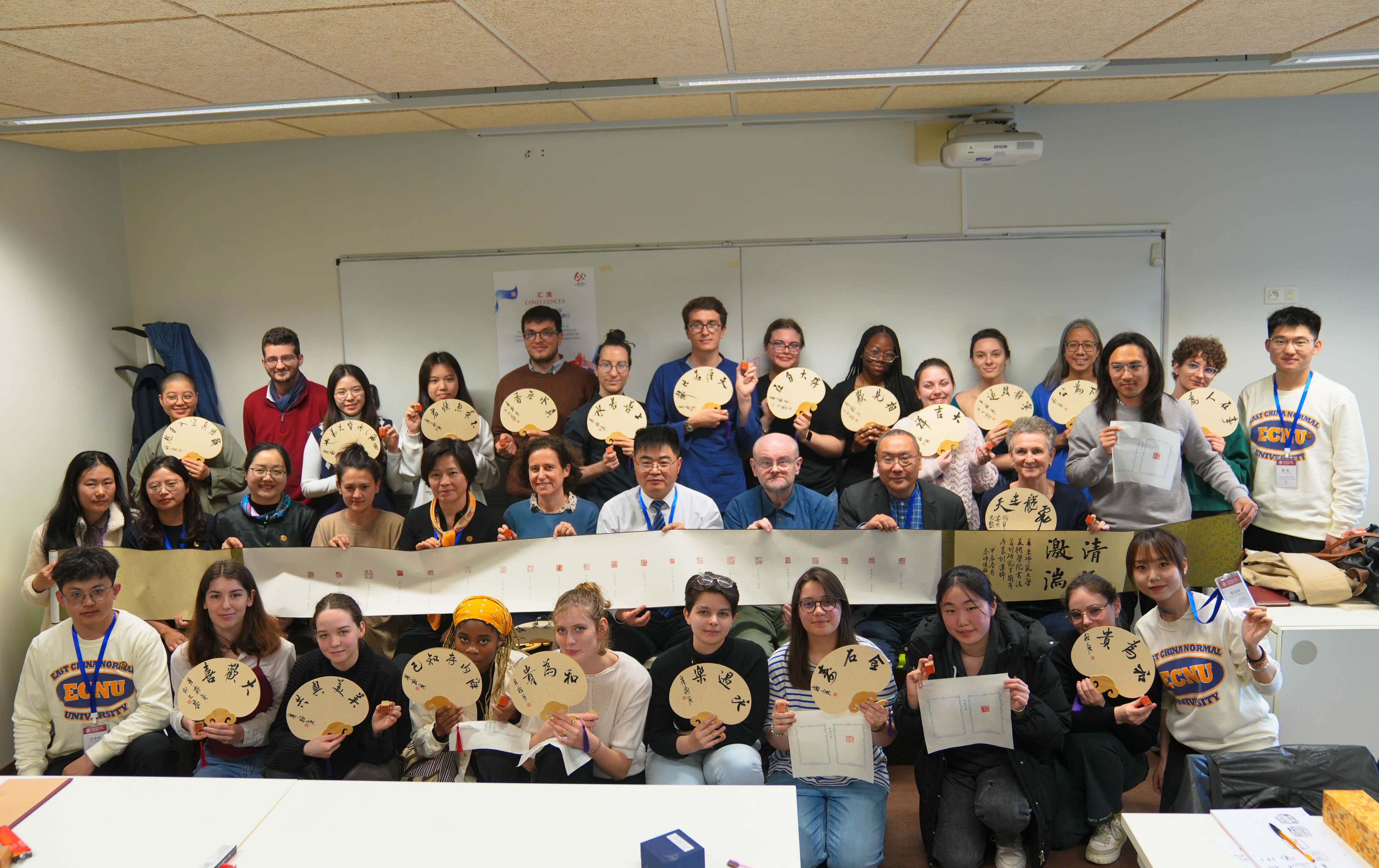 5月2日至5月6日,华东师大的“汉字走进法国校园”工作坊活动在新里昂中法大学、热纳斯镇路易·莱普林斯—林盖中学、里昂二大与里昂国际学校举行。当地的大中小学生和市民参观了由华东师大美术学院书法篆刻专业4位老师和43位在校研究生创作的书法篆刻作品,首次动手体验了篆刻的乐趣。