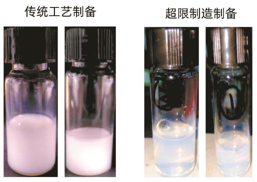 超限制造能使化妆品中的维生素E粒径从过去的几百纳米缩小到几十纳米,粒径分布大大窄化,外观澄清通透泛蓝光。(钱旭红供图)