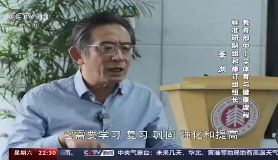 教育部中小学体育与健康课程标准研制组和修订组组长季浏:运动技能水平的提高需要学习、复习、巩固、强化和提高,不学习、不巩固、不强化是学不好这个技能的,国家课程标准里面已经明确提出,要采用专项运动技能的大单元教学,通过连续集中系统学习,应该说人人会一个运动项目,长期坚持下去就能改变我国绝大多数学生,学了十二年的体育课,却一项运动技能没有掌握的这种严重的问题。