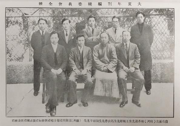 1932年大夏年刊编辑委员会全体成员合影,自右而左,前列:林希谦、王毓祥、马公愚、胡颂平,后列:汪辑熙、严步韩、刘修如、张汝砺、周秉维