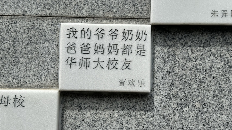 在校庆捐赠纪念墙上,查建渝儿子查欢乐说:我的爷爷奶奶爸爸妈妈都是华师大校友。