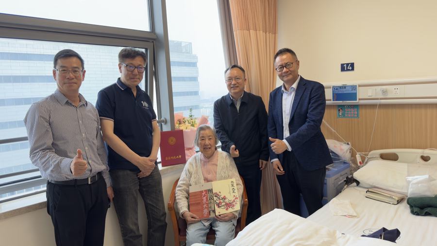 华东师大副校长雷启立、校友会副会长兼秘书长任开蕾等看望钱玉音老人。