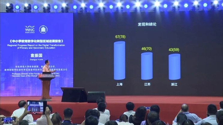 以全国首个教育数字化转型试点区——上海为龙头,沪苏浙的中小学“转”得怎么样?6日2024世界人工智能大会智能教育论坛上,基于上海、江苏、浙江10个地区100所学校的近万名教师、校长问卷调查,《中小学教育数字化转型区域进展报告》首发。按“百分制”衡量,报告表明,教育数字化转型的教师指数为53,校长指数则为70。分学段看,两省一市小、初、高的教师指数分别是56、55、49,校长指数为73、64、68,可见三地小学发展指数均高于中学。