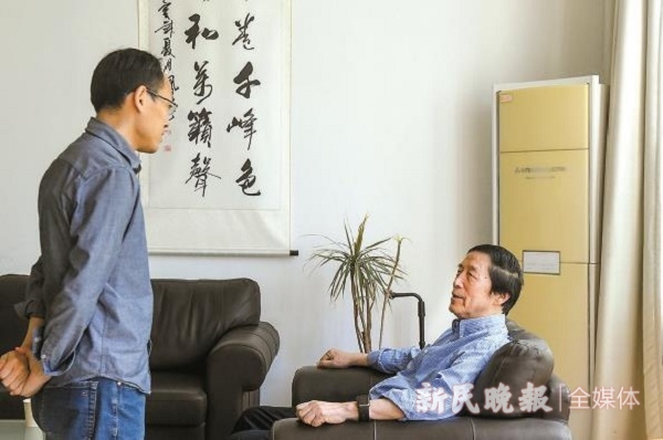 图说:和同事交流让他保持思维敏捷 新民晚报记者 陶磊 摄(下同)