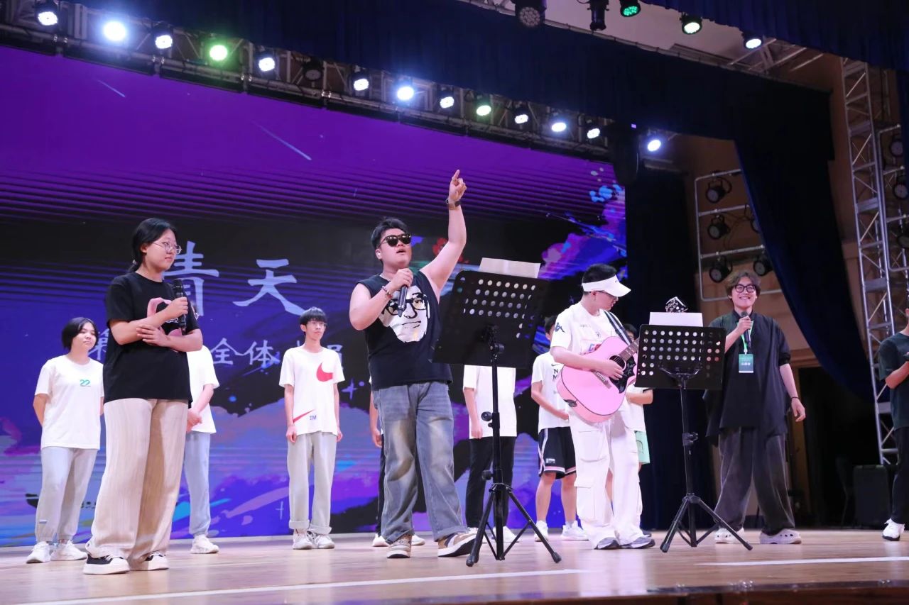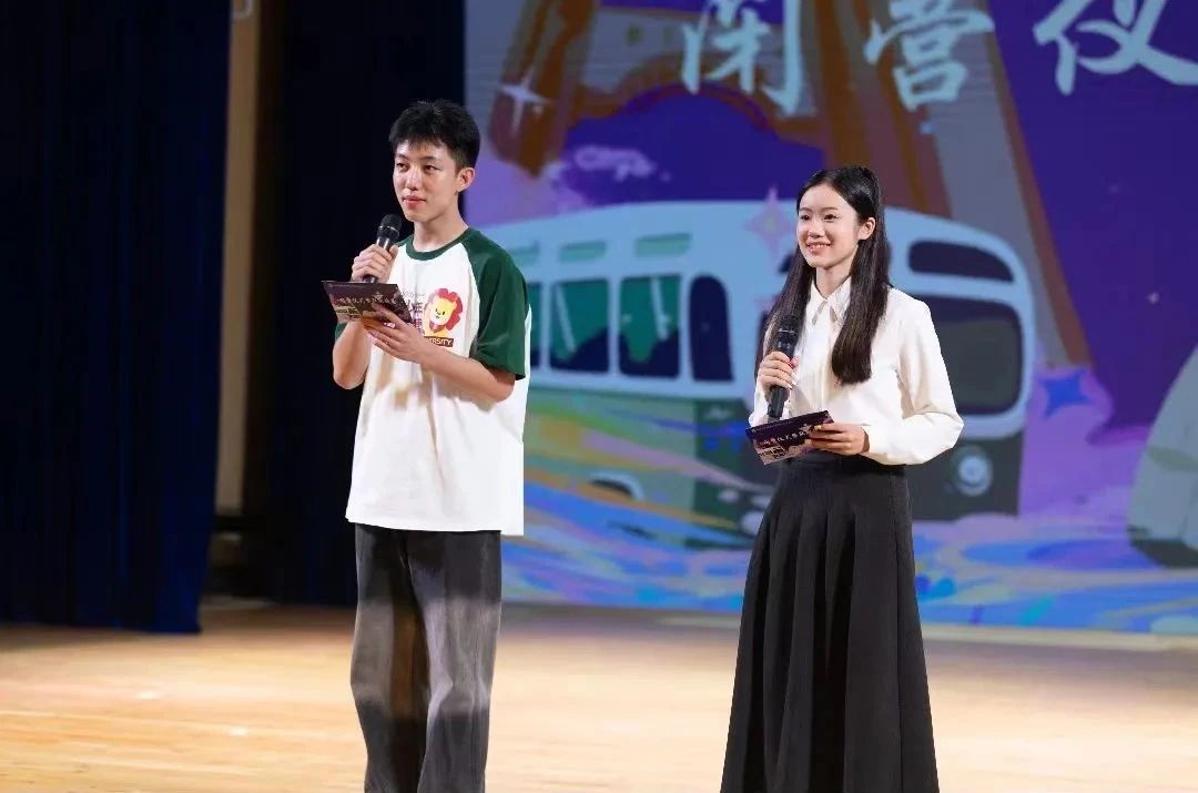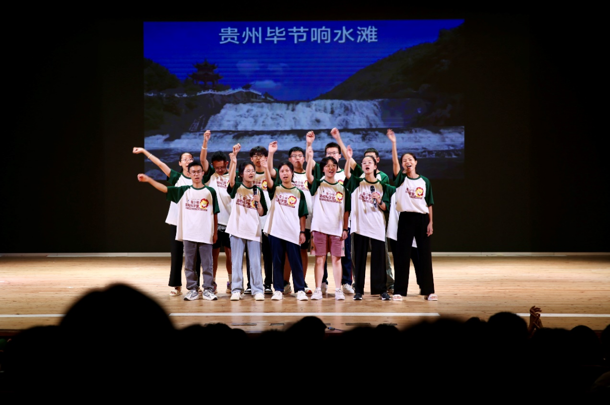 7月25日晚,随着暖场音乐与《奢香夫人》歌声的响起,科学营闭营联欢会缓缓拉开帷幕。营员们经过紧张而充分的彩排,准备了舞蹈串烧、诗朗诵、乐器演奏等形式多样、内容丰富的节目。舞蹈串烧节目中,营员们跟随《日不落》《快乐崇拜》等大家耳熟能详的欢快音乐节奏一起摇摆,现场气氛瞬间被点燃。由第九组营员们共同排演的课本剧《雷雨》再现了作品的经典桥段,带领现场营员们重新体验人民剧作家曹禺先生笔下近代中国大家族生活中复杂的爱恨纠葛。穿插在晚会过程中的惊喜颁奖环节掌声雷鸣。诗朗诵《再见,华师大》以充满诗意的优美文字回顾了营员们一周以来在风景如画的樱桃河畔经历的点滴美好,表达了营员们对师大的眷恋不舍之情。感情真挚的诗歌引起了在场营员们深刻的情感共鸣,大家沉浸在由朗诵声抒发出的纯粹情感中。“我们的时光/是无忧的时光/精彩的年月 不会被什么改写/放纵的笑语 时常回荡在我们耳旁/那些路上的脚印/永远不会被掩藏”,句句歌词道出了营员们的心声,晚会最后在全场合唱《我们的时光》的歌声中走向落幕。