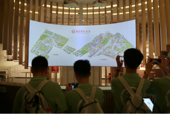 华东师大校史馆内,陈列的历史图片、资料和实物生动记录了学校各个阶段的发展历史。志愿者向营员们讲述了华东师大的校史沿革历程、师资队伍、体制改革、人才培养模式等内容。营员们还通过现代化的数字多媒体手段全方位认识了师大深厚的人文积淀。各位营员们纷纷拿出手机拍照,记录下自己感兴趣的内容与印象深刻的瞬间。