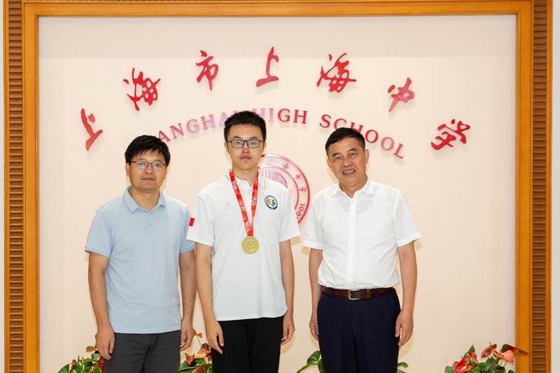 7月24日,上海中学校长冯志刚(右一)与数学竞赛教练王广廷老师、第65届国际数学奥林匹克(IMO)金牌得主王淳稷同学在一起。