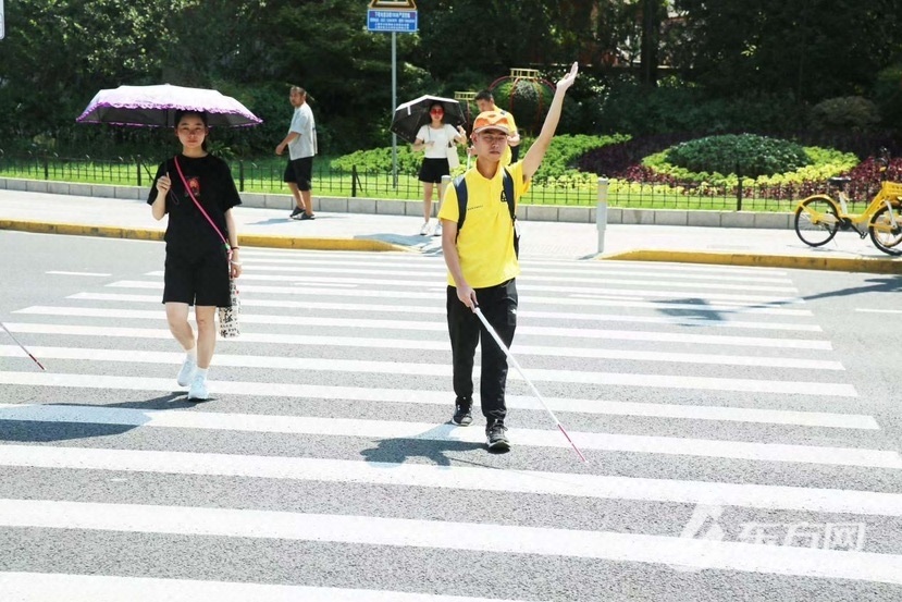 志愿者“陪伴”视障大学生过马路、探索学校周边交通路线