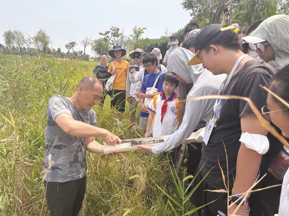 头顶36摄氏度高温,脚踩泥泞土地,上海市控江中学高二学生陆天沐来到位于金山区的鹦鹉洲生态湿地公园,用金属采样器采集到了约40厘米长的湿地土壤标本。