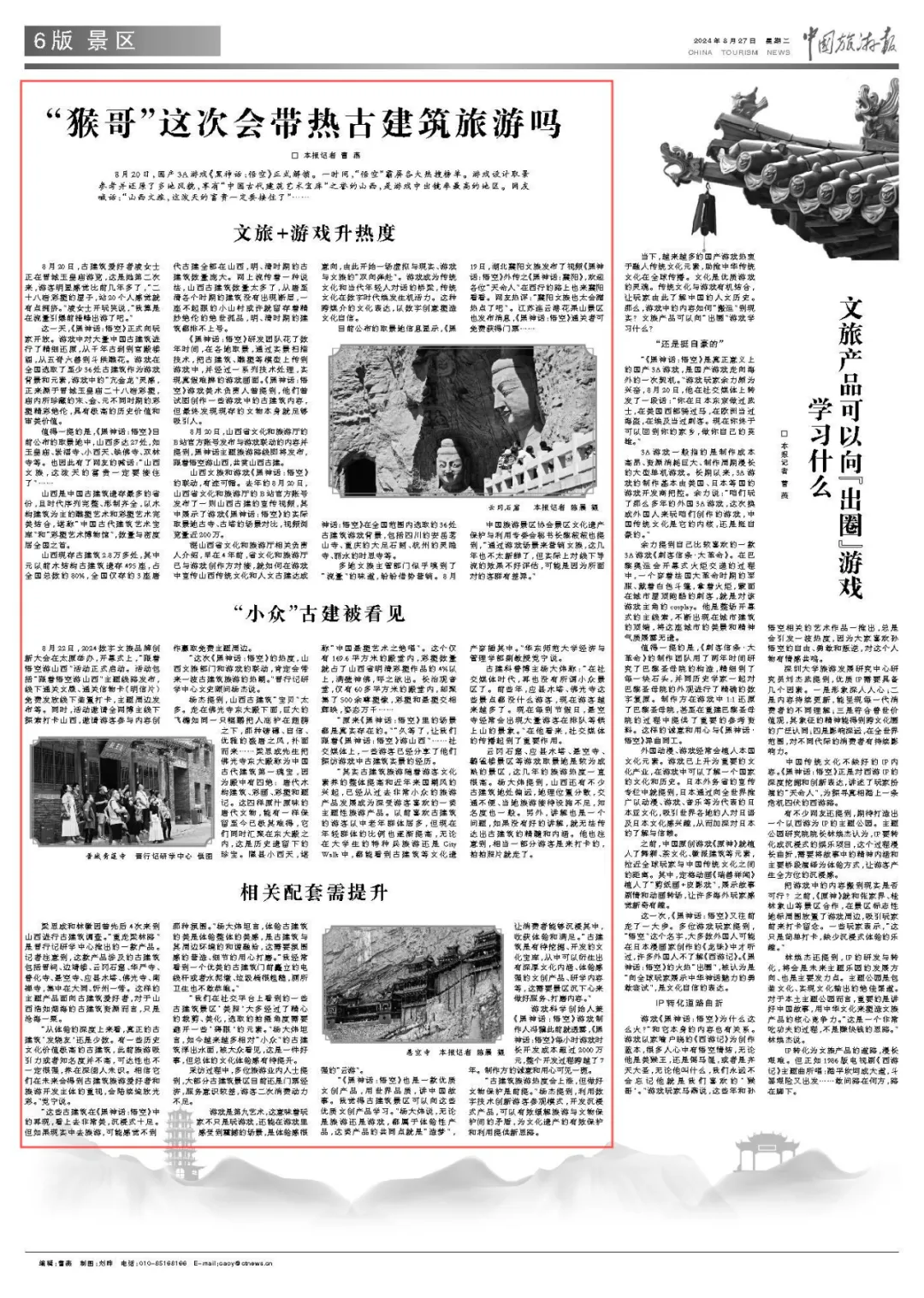 “这次《黑神话:悟空》的热度,山西文旅部门和游戏的联动,肯定会带来一波古建筑旅游的热潮。”晋行记研学中心文史顾问杨杰说。