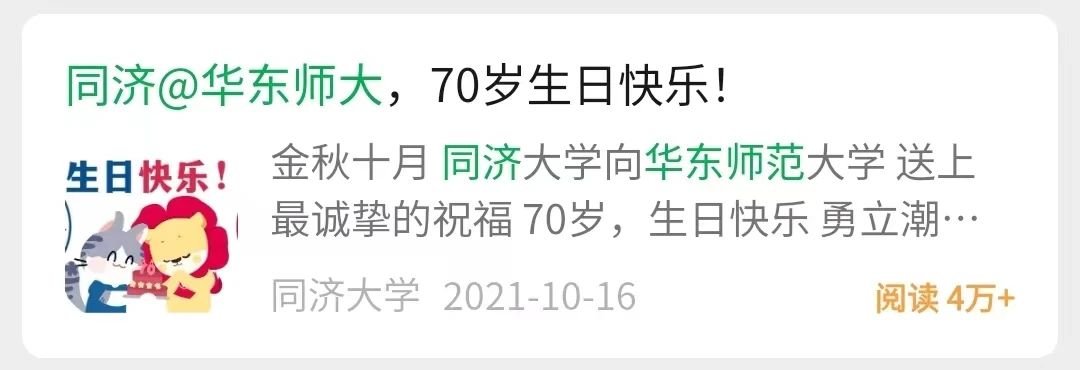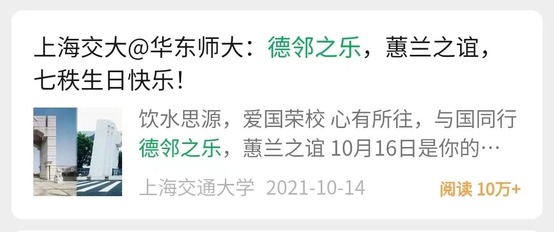七十周年校庆期间,与上海交通大学、同济大学、南开大学联动策划推出庆生推文,爆款作品如《上海交大@华东师大:德邻之乐,蕙兰之谊,七秩生日快乐!》《同济@华东师大,70岁生日快乐!》等,形成“共筑教育强国梦”的联动效应。