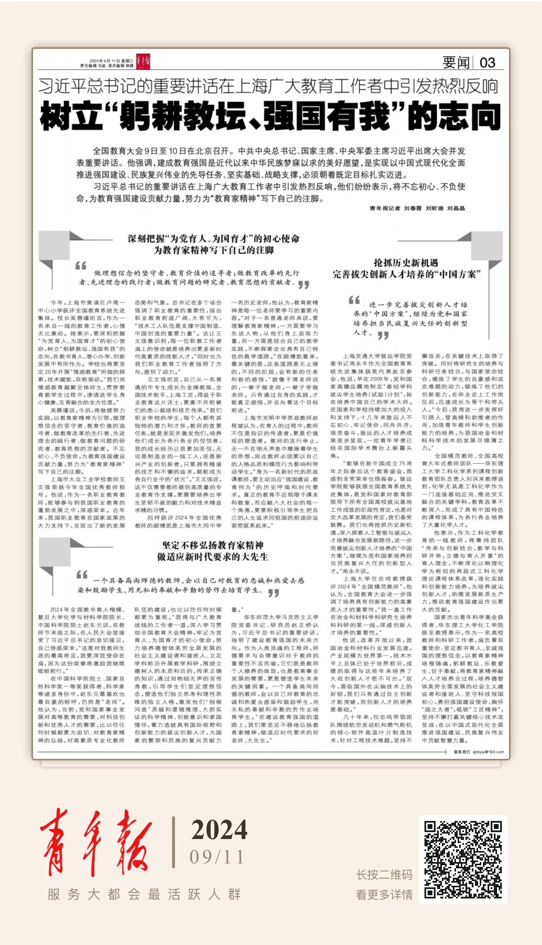 习近平总书记的重要讲话在上海广大教育工作者中引发热烈反响,他们纷纷表示,将不忘初心、不负使命,为教育强国建设贡献力量,努力为“教育家精神”写下自己的注脚。