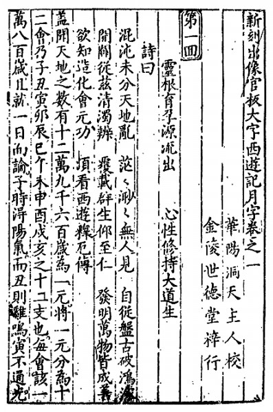 现存百回本《西游记》最早刊本是万历二十年(1592)金陵世德堂《新刻出像官板大字西游记》,简称世本。这是最重要的《西游记》善本,当代三大通行本皆以它为底本校勘。此前存在的大量“西游”作品,体裁多为话本、宝卷、变文、戏曲等通俗文艺,世本名副其实是百回本《西游记》小说诞生的标志。