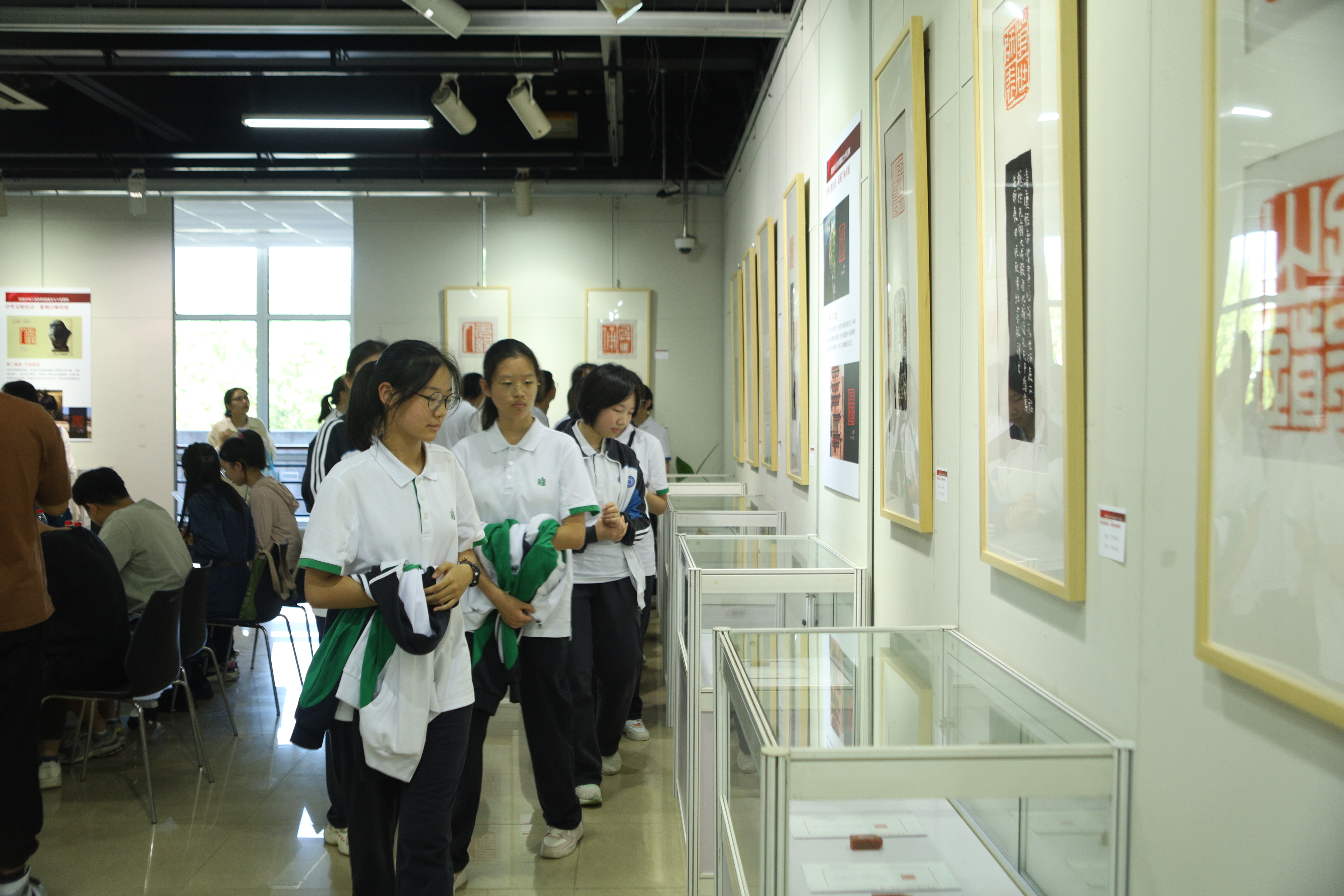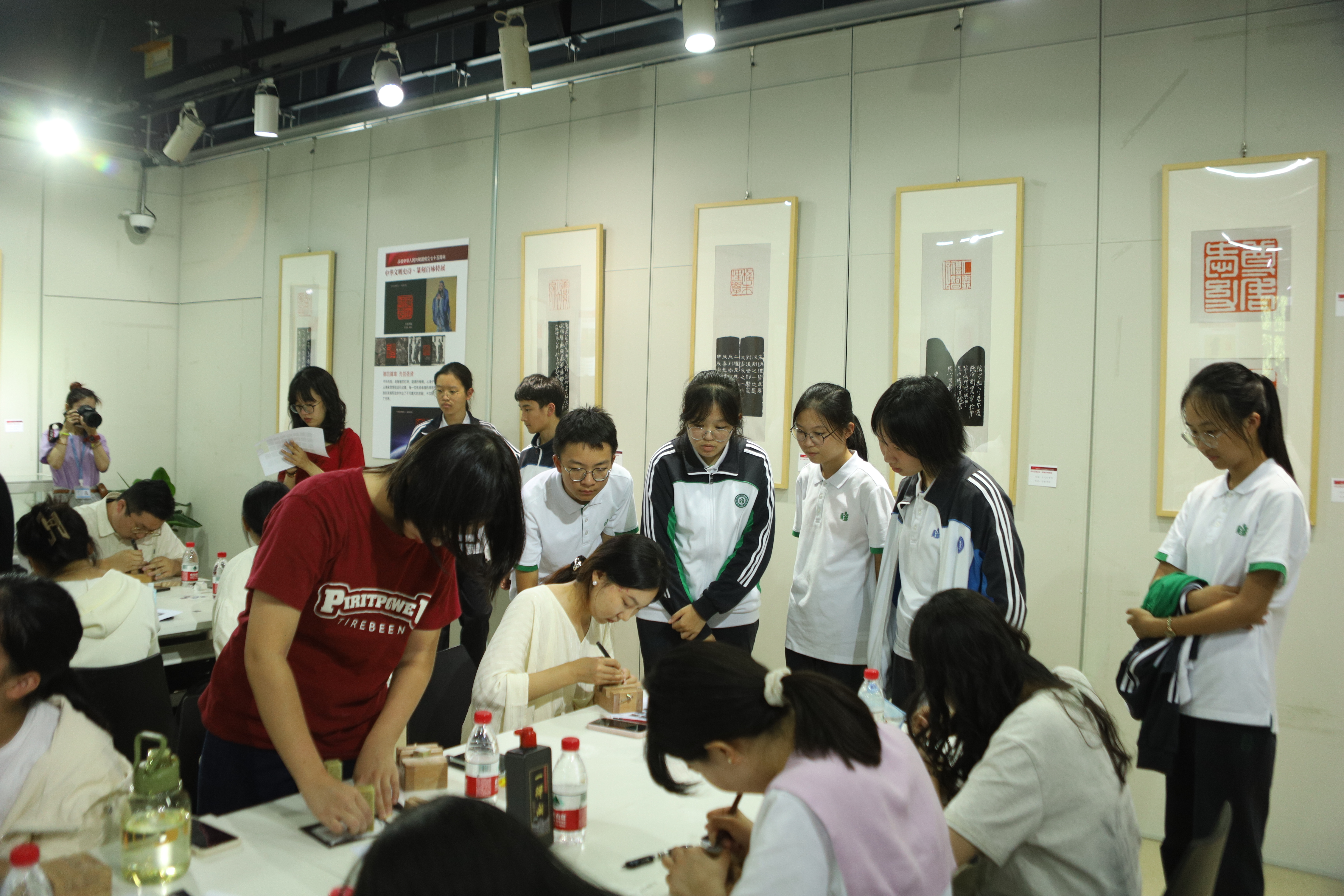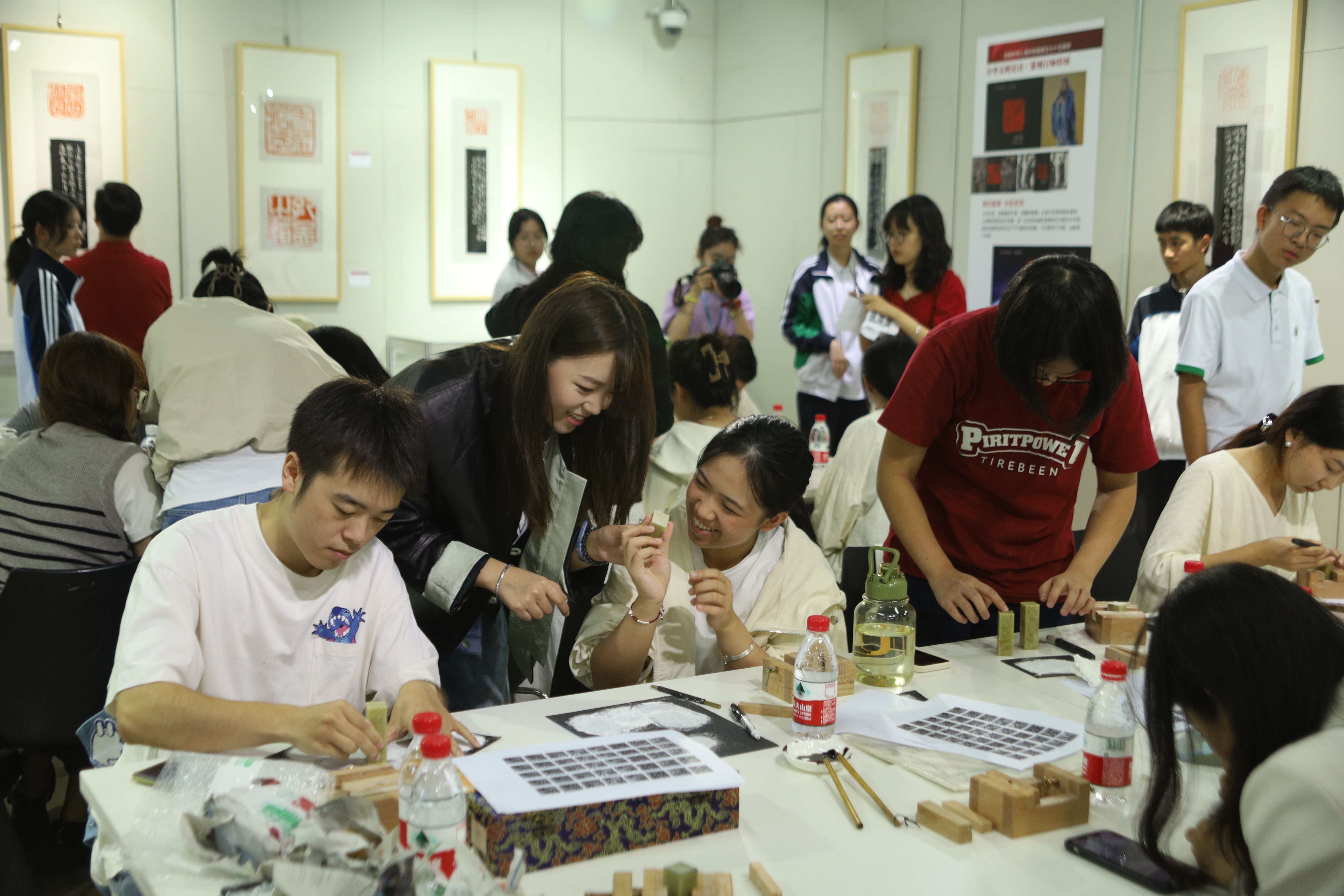 此次展览还同步举行了现场篆刻体验活动,吸引了华东师大不同院系的同学、国际留学生以及华东师大二附中学生参加,通过鲜活体验打造了一堂丰富生动的思政大课。