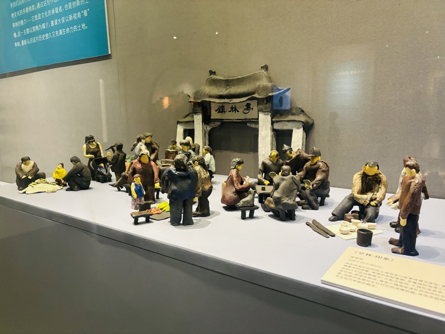 展览的最后还展示了学生团队的文创作品,探索了传统工艺的现代市场转化可能性。其中,“这里厢亭林”大富翁游戏将亭林历史文化以娱乐性形式展现,兼具趣味与深度;“袋足陶鬶”通过创新设计焕发新的艺术生命力,体现了非遗文化的现代演绎。