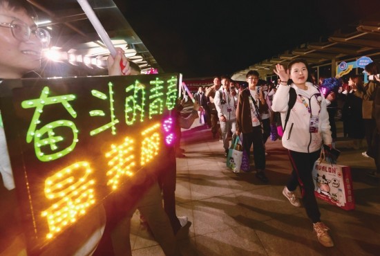 《年轻的力量》《夜空中最亮的星》《红日》《再见》……乐队现场演奏起“小叶子”们心爱的旋律,来自各校的“小叶子”们列队而过,他们挥手、击掌,荧光棒在空中摇曳生辉。“小叶子冲鸭”“致那些披星戴月的日子”……五彩斑斓的灯牌标语在国家会展中心东登录厅的天桥上闪烁。
