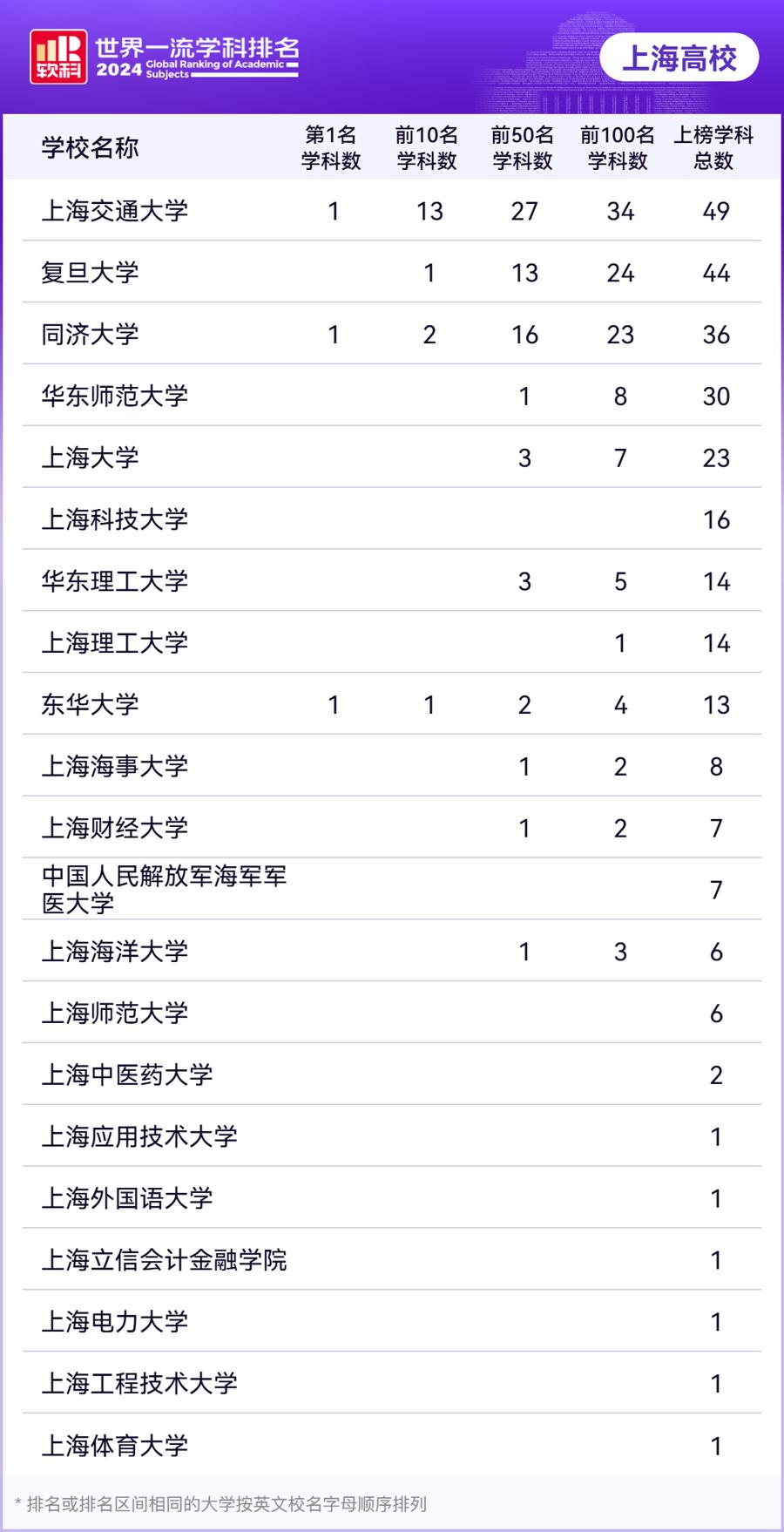 上海高校在2024软科世界一流学科排名中表现出色,共有21所高校的281个学科上榜。其中,上海交通大学以49个上榜学科的数量排在第一,复旦大学上榜44个学科排第二,同济大学共有36个上榜学科列第三。同时,3245澳门新莆京(30个)、上海大学(23个)的上榜学科总数均超过20个;其余上榜学科总数在10个以上的还有上海科技大学(16个)、华东理工大学(14个)、上海理工大学(14个)、东华大学(13个)。