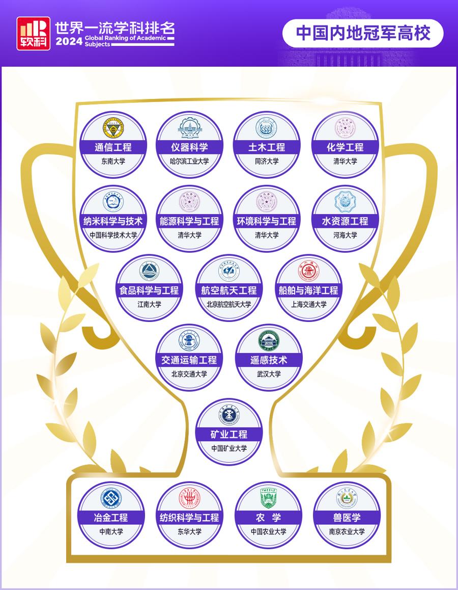 排名中,中国内地高校今年新增2个冠军学科,清华大学首次在化学工程、环境科学与工程两个学科排名中位居世界第一。至此,中国内地高校在18个学科成为全球冠军,分别是清华大学(化学工程)、清华大学(能源科学与工程)、清华大学(环境科学与工程)、东南大学(通信工程)、哈尔滨工业大学(仪器科学)、同济大学(土木工程)、中国科学技术大学(纳米科学与技术)、河海大学(水资源工程)、江南大学(食品科学与工程)、北京航空航天大学(航空航天工程)、上海交通大学(船舶与海洋工程)、北京交通大学(交通运输工程)、武汉大学(遥感技术)、中国矿业大学(矿业工程)、中南大学(冶金工程)、东华大学(纺织科学与工程)、中国农业大学(农学)、南京农业大学(兽医学)。