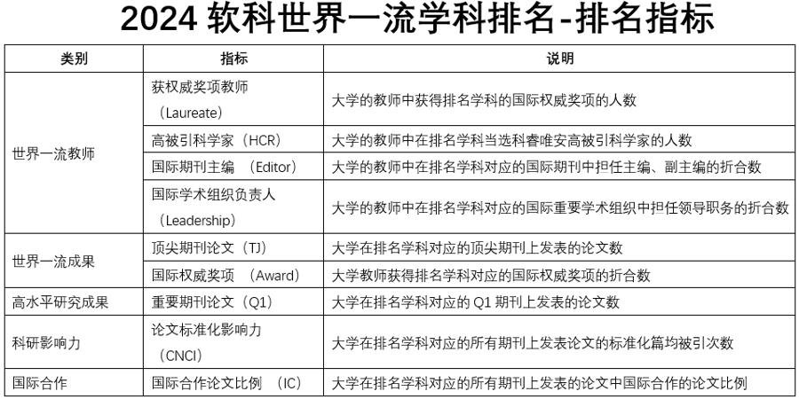 今年对排名体系进行了重要扩充和优化,引入“世界一流教师”这一全新指标模块,与“世界一流成果”模块共同组成学科排名的核心评价内容。其中,“世界一流教师”模块包括4项评价指标,分别是获国际权威奖项教师、高被引科学家、国际期刊主编、国际学术组织负责人;而“世界一流成果”模块包括顶尖期刊论文、国际权威奖项2项排名指标。此外,排名体系还采用了重要期刊论文、论文标准化影响力、国际合作论文比例等指标。