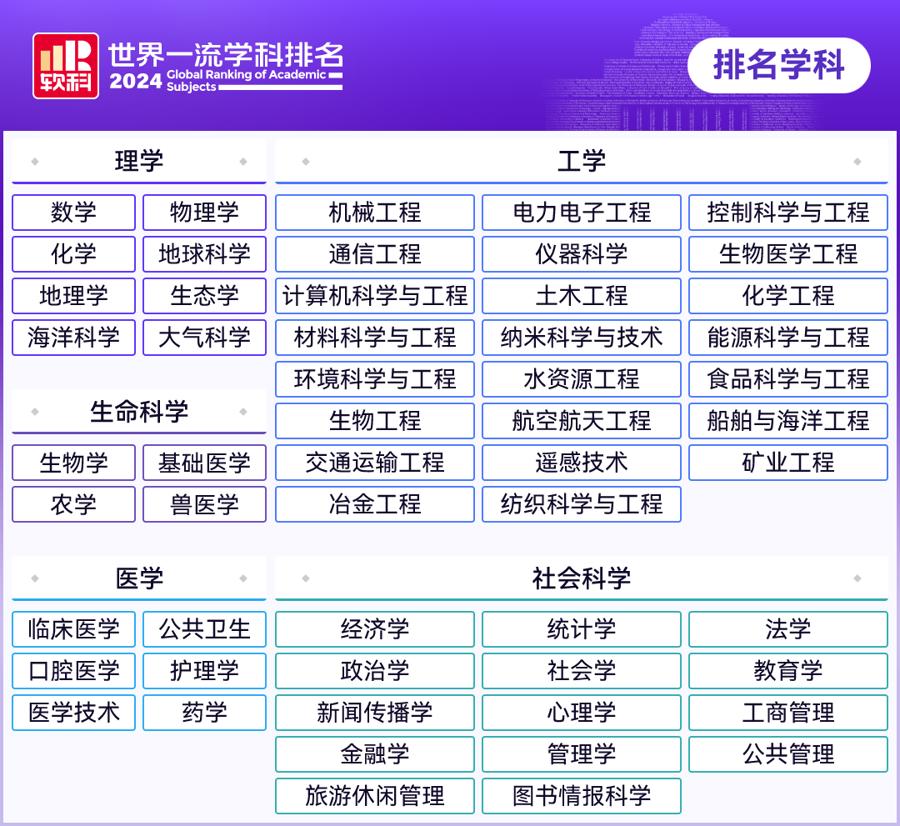 理工农医文商,各种学科是大学的四梁八柱,一流大学必有一流学科。11月11日,涵盖理学、工学、生命科学、医学、社会科学五大领域55个学科类别的2024“软科世界一流学科排名”(ShanghaiRanking's Global Ranking of Academic Subjects)发布。
