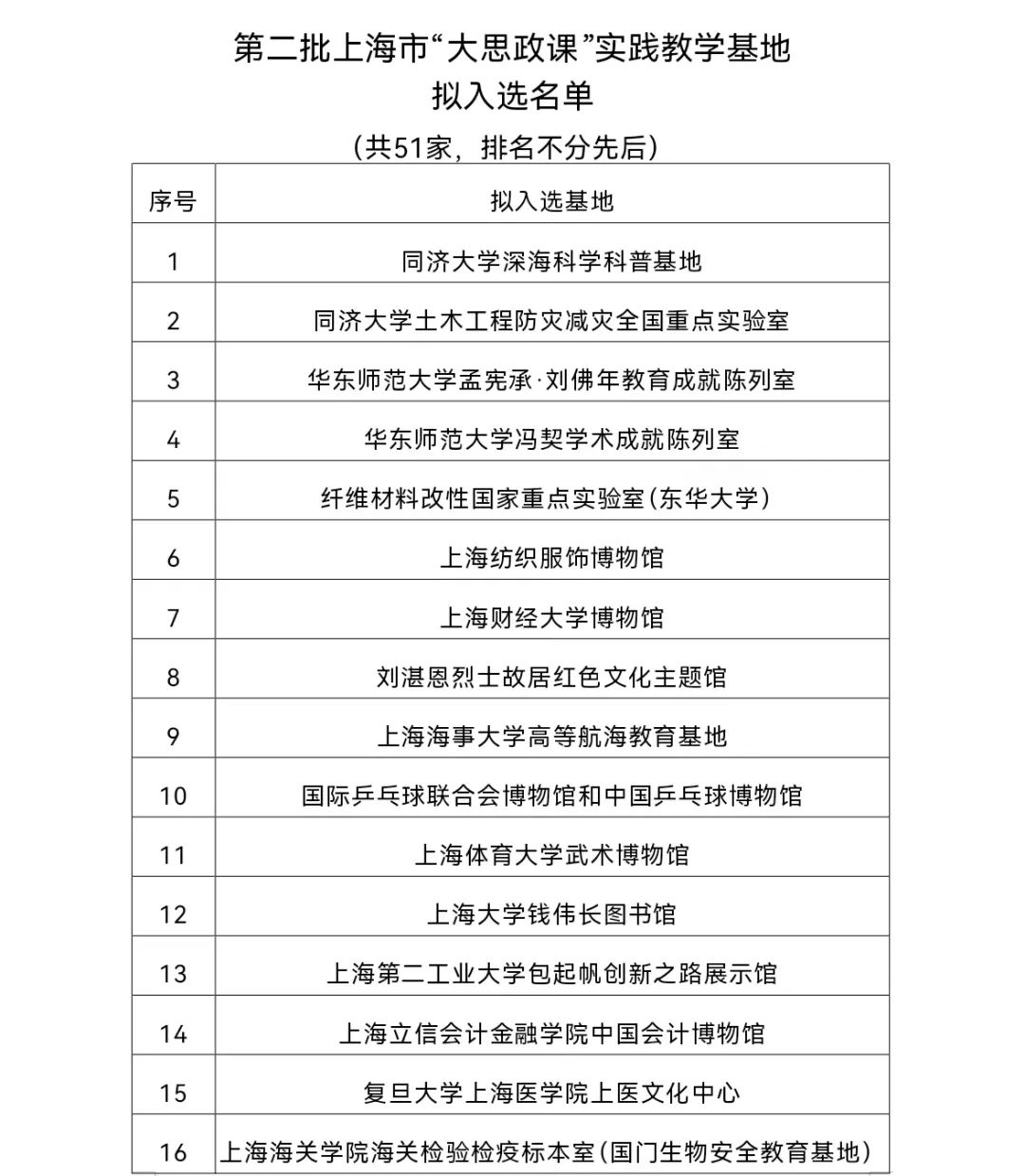 根据《中共上海市教育卫生工作委员会 上海市教育委员会关于开展第二批上海市“大思政课”实践教学基地遴选工作的通知》(沪教委德〔2024〕31号)要求,经相关委办局、高校、区教育局推荐,材料审核及专家组评审等环节,拟入选第二批上海市“大思政课”实践教学基地51家。现定于2024年11月25日至11月29日,对入选基地名单进行网上公示。