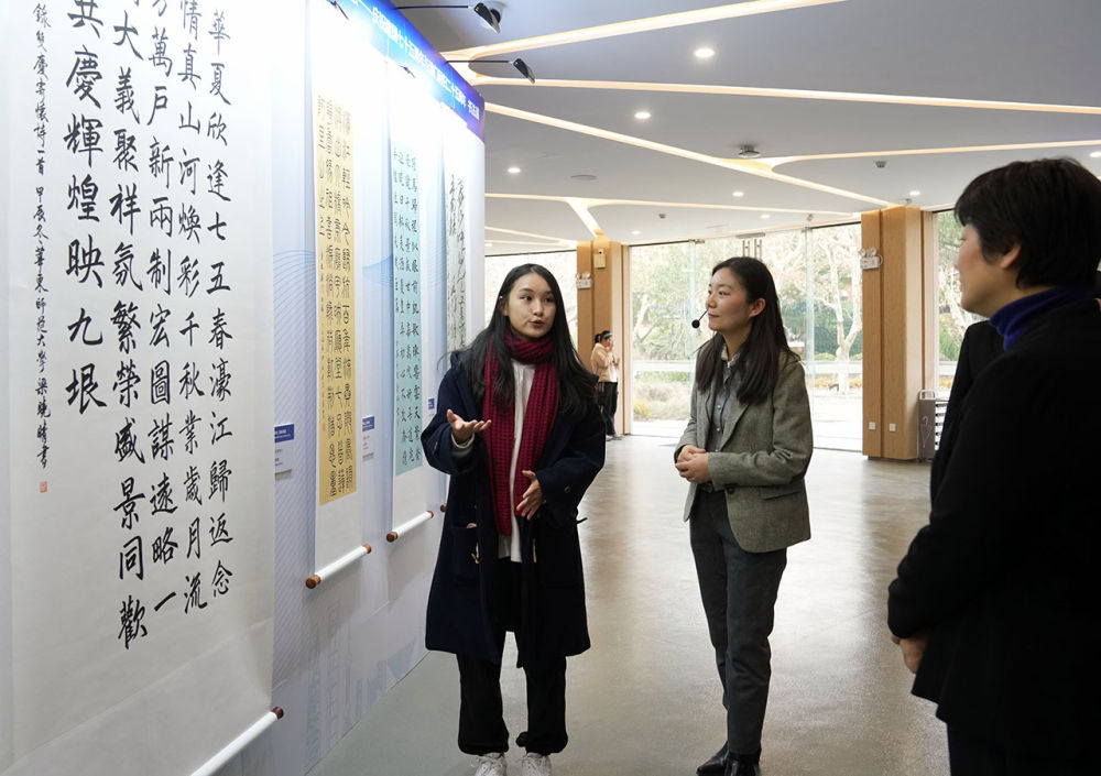 来自澳门的、华东师大2023级汉语言文学专业的学生梁晓晴(左)介绍自己参展的书法作品《双庆寄怀》。