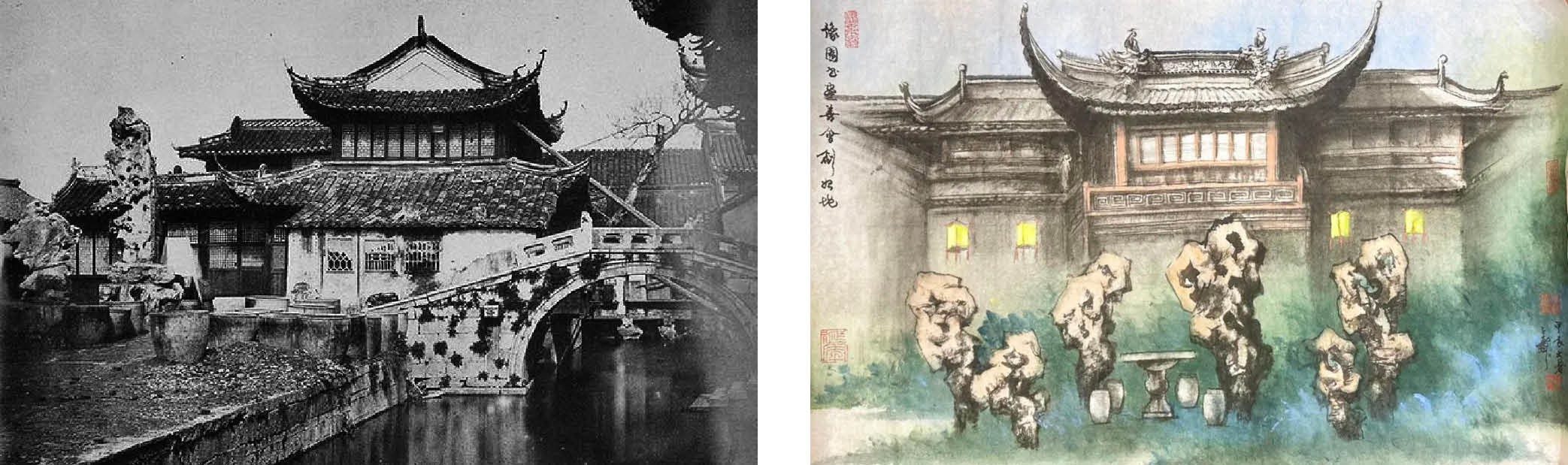 左图:1857年的豫园照片。右图:胡考 《豫园书画善会》中绘有豫园太湖石。