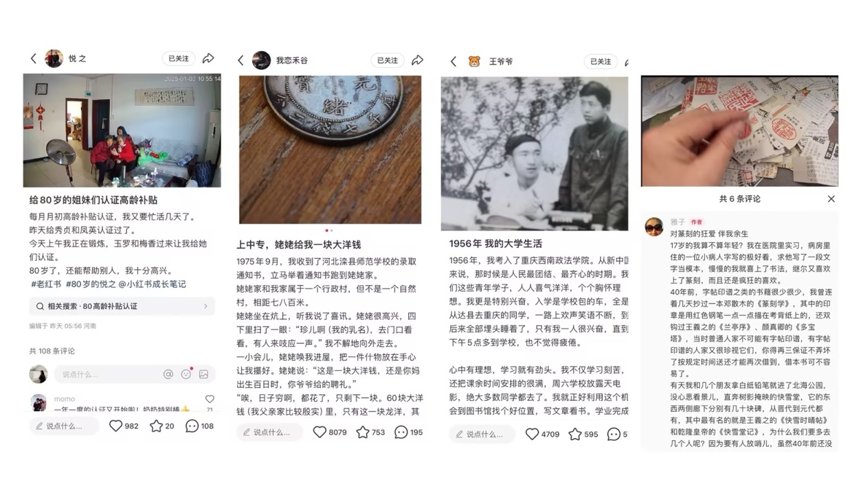 小红书的数据显示,截止2024年底,60岁以上的老年月活跃用户已超过3000万。他们不仅“刷”小红书,而且主动分享生活、创作内容。老年创作者的数量在过去两年增长了三倍,累计已发布笔记超过 1 亿篇。网友们亲切地把老人们分享的故事称为“老红书”。