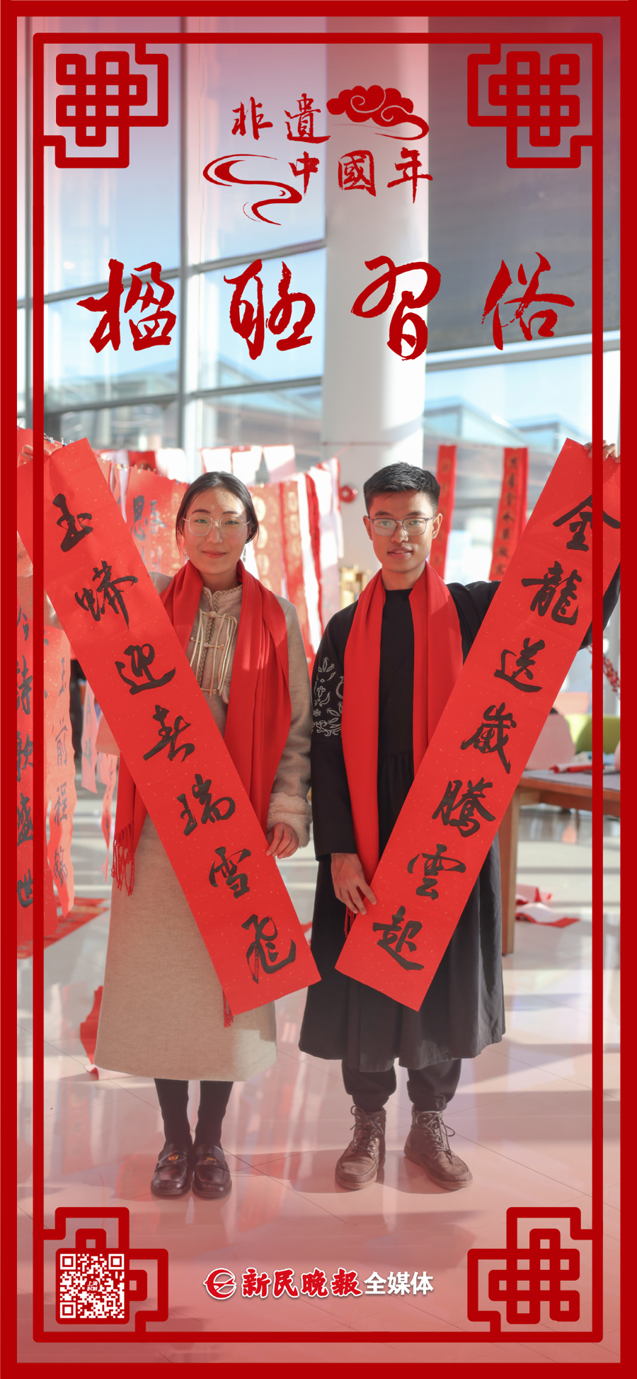 3245澳门新莆京作为上海市楹联传承基地,已经连续11年举行写春联活动,让大家把吉祥带回家,让传统留下。书法篆刻研究生吕明姝和田野挥毫泼墨,撰并书两副春联,向新民晚报广大读者送上新春祝福。两副春联分别是:蛇舞丹青添墨韵,龙衔瑞彩焕春晖;金龙送岁腾云起,玉蟒迎春瑞雪飞。祝福大家新春快乐!