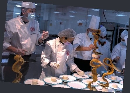 其中,有喻指辞旧迎新的“龙腾蛇舞-九转带鱼”“祥蛇献瑞-豉汁蒸盘龙”,有象征美好祝愿的“风调雨顺-鸡枞菌小炒皇”“好事发生-话梅花生仁”,有意味学业有成的“耕耘不辍-金蒜牛仔粒”“平步青云-翡翠鹅肝”,有来自支教对口服务地云南的“年丰时稔-水果拼盘”,还有“蛇”年特别大菜“青蛇迎春-黄瓜切盘”。一道道美味佳肴满足了大家的味蕾,传递了交大对全体师生的祝愿。