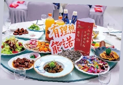 上海对外经贸大学的团圆晚宴在1月 27日晚上开席,为弘扬中国传统饮食文化,学校食堂也精挑细选多款特色菜肴,并赋予特别的命名。当晚,除了8道冷菜外,还有10道热菜:荣华富贵(清蒸鳜鱼)、蒸蒸日上(糯米排骨)、吉祥如意(红烧羊肉)、甜甜蜜蜜(菠萝咕咾肉)、金榜题名(红烧蹄髈)、红红火火(避风塘炒虾)、四季平安(荷兰豆炒腊肠)、百财聚来(蒜蓉粉丝蒸娃娃菜)、源滚滚来(蚝油生菜)、甜蜜八仙(金银八宝饭)、百年皆好合(红豆沙圆子羹)和万紫千红硕果累(精美果盘),邀留校师生共赴美食盛宴,感受“家”的温暖与“年”的味道。