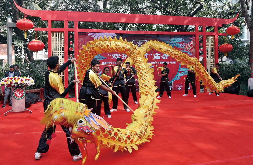 2025年1月10日,在孟加拉国首都达卡,表演者在“欢乐春节”庙会上舞龙。