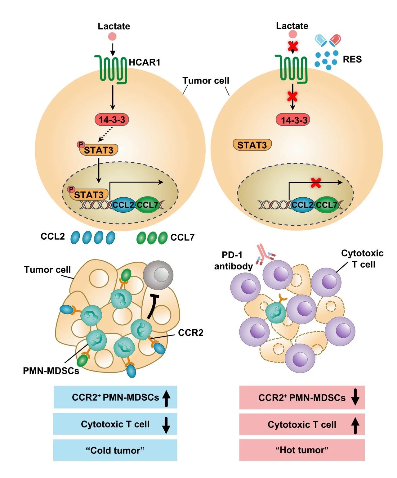 研究团队发现,乳酸通过激活其特异性受体HCAR1促进肿瘤细胞高表达趋化因子CCL2和CCL7,从而招募具有强免疫抑制活性的多形核髓源性抑制细胞(PMN-MDSCs)进入肿瘤微环境。体内敲除HCAR1基因可显著降低肿瘤组织中PMN-MDSCs的含量,增强T细胞介导的抗肿瘤免疫反应。