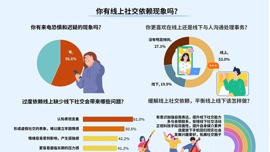 2024-11-15随着线上社交的广泛普及和媒介工具的快速发展,人们社交习惯和生活方式都在发生改变。在线聊天、建立工作群……不知不觉地,线上成了很多人沟通接洽的“舒适区”,偶尔接到电话还会不自然、不习惯。不少人因此困扰,感到自己线下社交能力退化了。 上周,中国青年报社社会调查中心联合问卷网(wenjuan.com),对1335名受访者进行的一项调查显示,56.6%的受访者有来电恐惧或迟疑,且年龄越小这种情况越凸显。长期依赖线上...