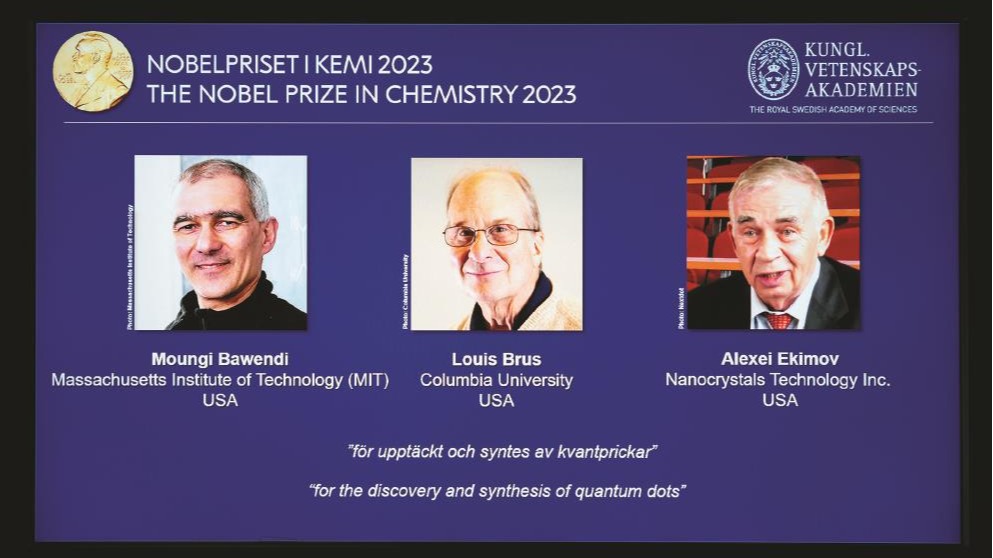 10月4日,在瑞典斯德哥尔摩的2023年诺贝尔化学奖公布现场,屏幕上显示奖项得主蒙吉·巴文迪(左)、路易斯·布鲁斯(中)和阿列克谢·叶基莫夫的照片。 新华社发 10月4日,瑞典皇家科学院宣布将2023年诺贝尔化学奖授予美国麻省理工学院教授蒙吉·巴文迪(Moungi Bawendi)、美国哥伦比亚大学教授路易斯·布鲁斯(Louis Brus)和美国纳米晶体科技公司科学家阿列克谢·叶基莫夫(Alexei Ekimov),以表彰他们对量子点的发现与合成...
