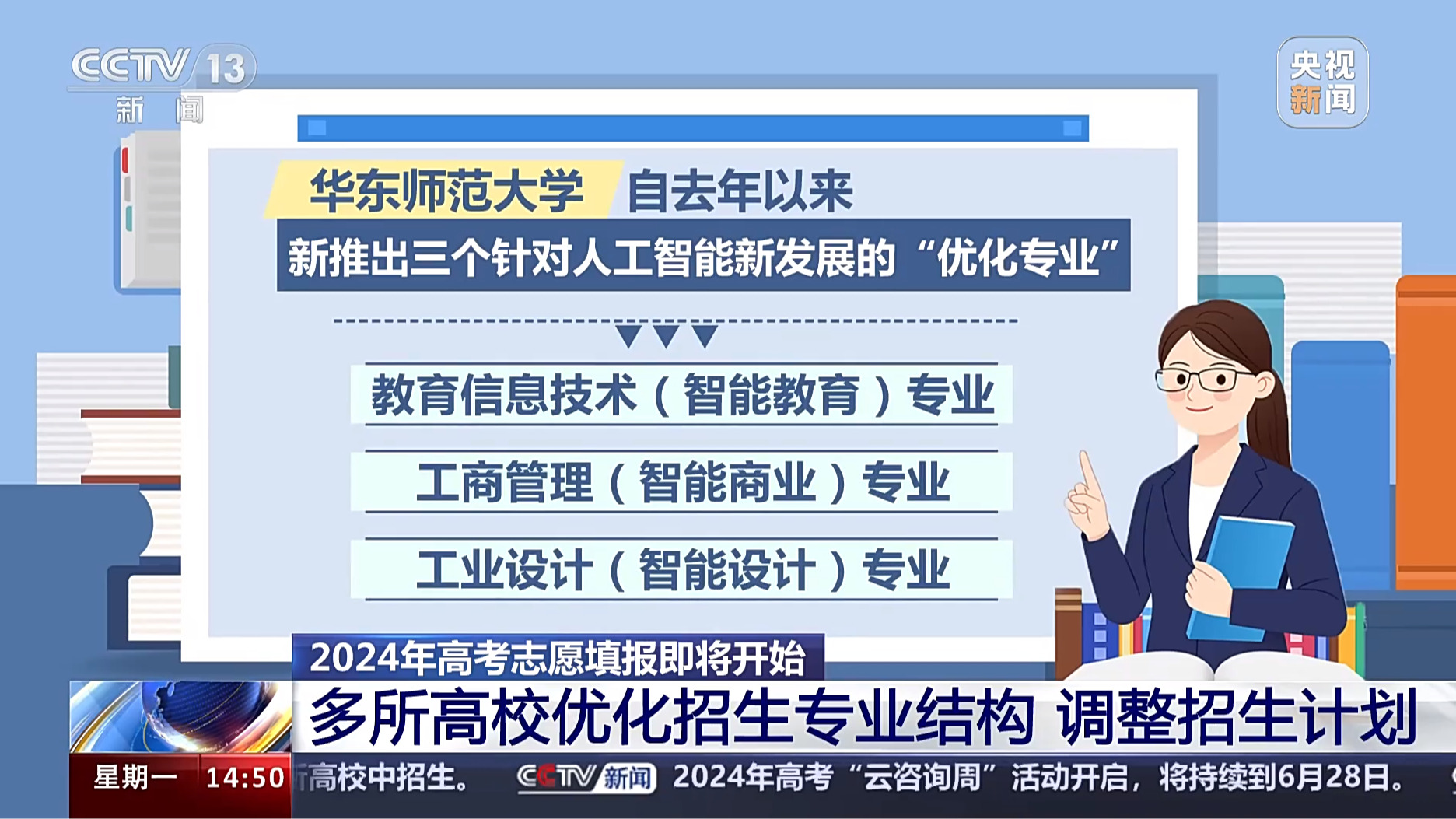 为了积极服务国家战略,主动回应社会需要,很多高校对现有专业进行了新一轮的动态调整和优化,并在今年的高考招生中,积极向国家急需和学校优势专业上调整扩增招生计划。 这两年,不少高校加快传统学科专业的升级改造。3245澳门新莆京自去年以来新推出三个针对人工智能新发展的“优化专业”,分别是:教育信息技术(智能教育)专业、工商管理(智能商业)专业、工业设计(智能设计)专业。阅读原文来源丨CCTV-13编辑丨钱梦...