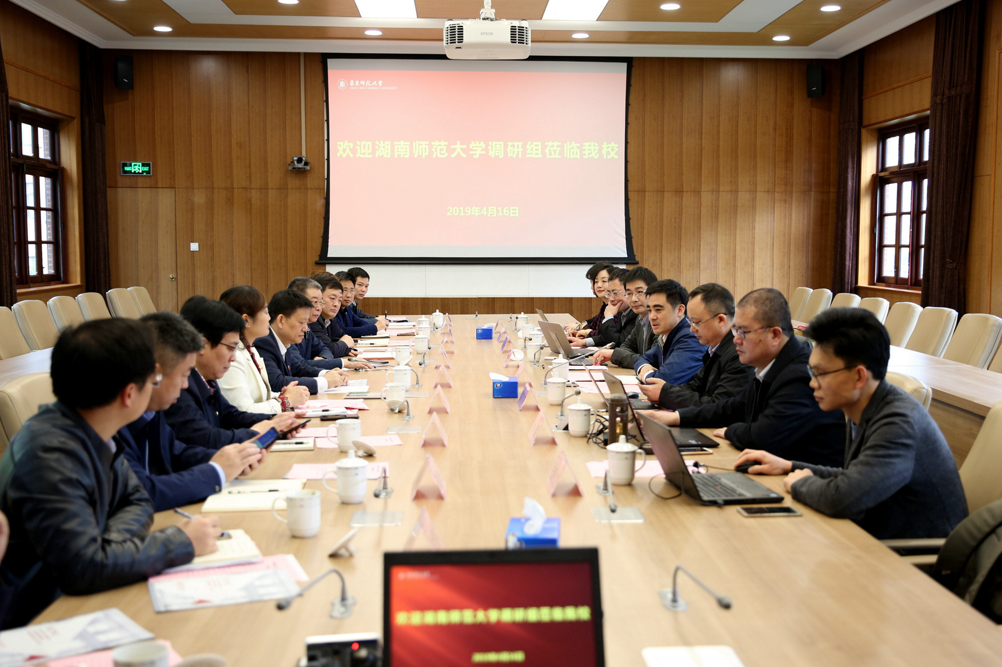 4月16日,湖南师范大学校长蒋洪新一行来校调研。校党委常务副书记王宏舟会见了蒋洪新一行,两校相关职能部门负责人就宣传工作、一流本科教育、学生思想政治工作、第二课堂体系建设、思政课程建设、学科绩效评价机制等...