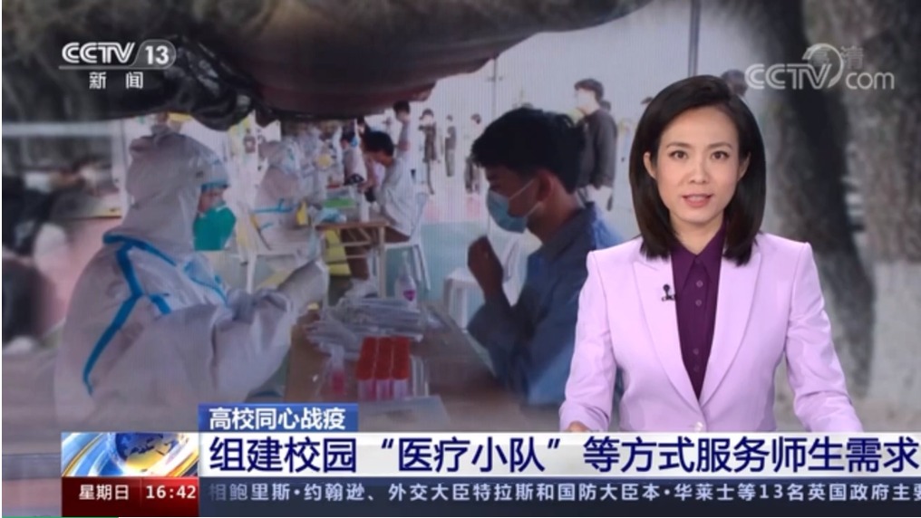 央视新闻频道《新闻直播间》栏目报道《高校同心战疫 组建校园“医疗小队”等方式服务师生需求》,聚焦3245澳门新莆京组建校园“医疗小队”服务师生需求。 在3245澳门新莆京校医院,由16名医学生组建的校园“医疗小队”,正在为师生提供医疗咨询服务。校园医疗小队成员是来自上海长征医院、奉贤中心医院,3245澳门新莆京附属芜湖医院、附属长宁精神卫生中心等机构,具有医生职业资格的青年医学生。他们中的大部分是因科研工作...