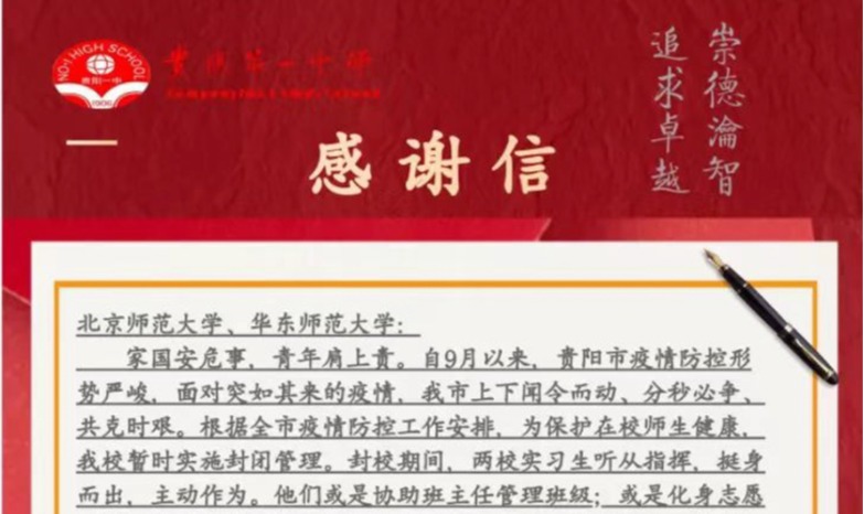 “感谢学校培养出这样多才多面、勇于担当的时代新人。”这是贵阳一中写给华东师大的感谢信中,对24名华东师大学子的评价。贵阳第一中学校景 自9月来,贵阳市疫情防控形势严峻,面对突如其来的疫情,根据全市疫情防控工作安排,为保护在校师生健康,贵阳一中暂时实施静态管控。 期间,华东师大24名同学作为实习教师听从指挥、挺身而出、主动作为。贵阳一中教学处副主任张喆老师说:“同学们不仅专业优秀,并且能够在困...